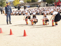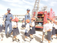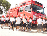消防クラブ隊員の消火訓練や、1年生が国語科の学習とも関連した働く車の観察を通して、命を守る行動について考える貴重な時間になりました!